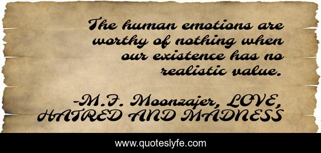 This page presents the quote "The human emotions are worthy of nothing when our existence has no realistic value.". Author of this quote is M.F. Moonzajer, LOVE, HATRED AND MADNESS. This quote is about emotions, realistic, value, human, worthy, nothing, existence,.