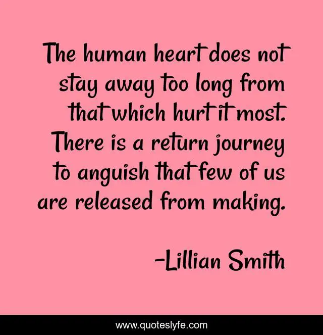 This page presents the quote "The human heart does not stay away too long from that which hurt it most. There is a return journey to anguish that few of us are released from making.". Author of this quote is Lillian Smith. This quote is about anguish, suffering, pain, healing,.