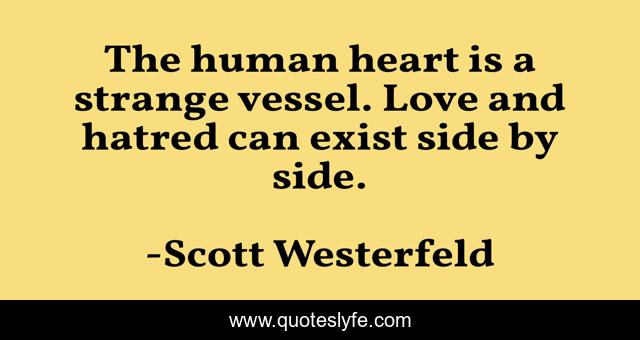 This page presents the quote "The human heart is a strange vessel. Love and hatred can exist side by side.". Author of this quote is Scott Westerfeld. This quote is about love, affection,.
