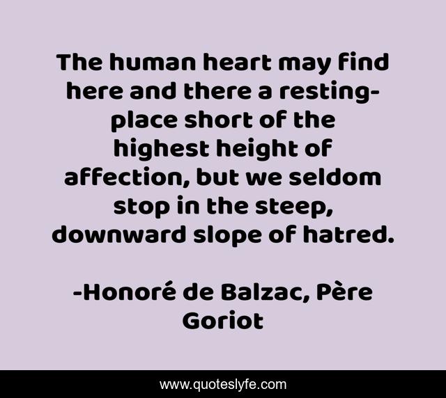 This page presents the quote "The human heart may find here and there a resting-place short of the highest height of affection, but we seldom stop in the steep, downward slope of hatred.". Author of this quote is Honoré de Balzac, Père Goriot. This quote is about dislike, hatred, evil,.