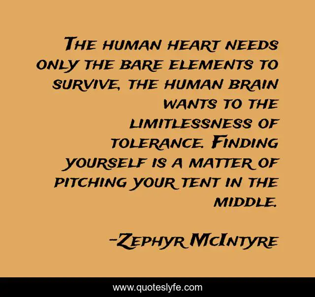 This page presents the quote "The human heart needs only the bare elements to survive, the human brain wants to the limitlessness of tolerance. Finding yourself is a matter of pitching your tent in the middle.". Author of this quote is Zephyr McIntyre. This quote is about philosophy-of-life, finding-balance,.