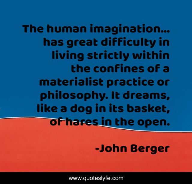 This page presents the quote "The human imagination... has great difficulty in living strictly within the confines of a materialist practice or philosophy. It dreams, like a dog in its basket, of hares in the open.". Author of this quote is John Berger. This quote is about great, dog, dreams,.