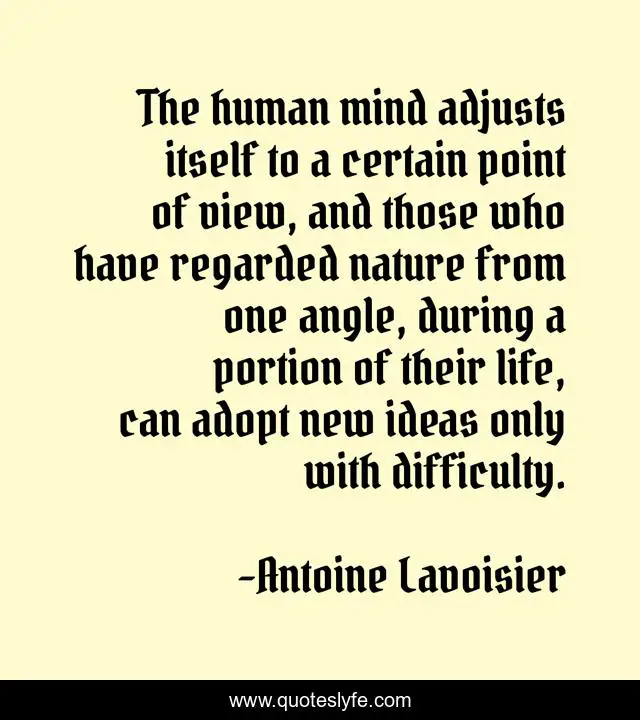 This page presents the quote "The human mind adjusts itself to a certain point of view, and those who have regarded nature from one angle, during a portion of their life, can adopt new ideas only with difficulty.". Author of this quote is Antoine Lavoisier. This quote is about alchemy, chemistry, mind, ideas, nature,.