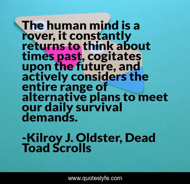 This page presents the quote "The human mind is a rover, it constantly returns to think about times past, cogitates upon the future, and actively considers the entire range of alternative plans to meet our daily survival demands.". Author of this quote is Kilroy J. Oldster, Dead Toad Scrolls. This quote is about thinking, memories, mind-power, restless-mind,.