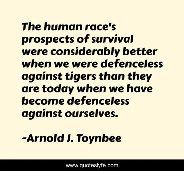 This page presents the quote "The human race's prospects of survival were considerably better when we were defenceless against tigers than they are today when we have become defenceless against ourselves.". Author of this quote is Arnold J. Toynbee. This quote is about better, survival, today,.