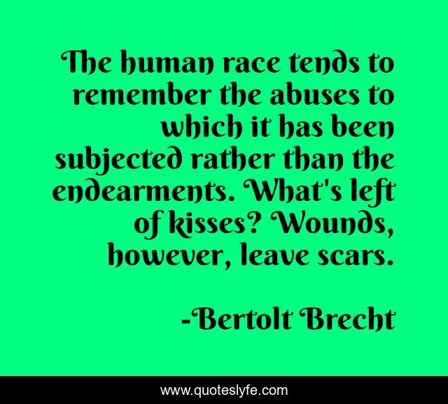 This page presents the quote "The human race tends to remember the abuses to which it has been subjected rather than the endearments. What's left of kisses? Wounds, however, leave scars.". Author of this quote is Bertolt Brecht. This quote is about life, scars, wounds, abuse, mankind, kiss, humanity, history,.