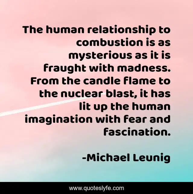 This page presents the quote "The human relationship to combustion is as mysterious as it is fraught with madness. From the candle flame to the nuclear blast, it has lit up the human imagination with fear and fascination.". Author of this quote is Michael Leunig. This quote is about imagination, relationship,.