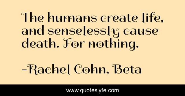 This page presents the quote "The humans create life, and senselessly cause death. For nothing.". Author of this quote is Rachel Cohn, Beta. This quote is about life, death, humans,.