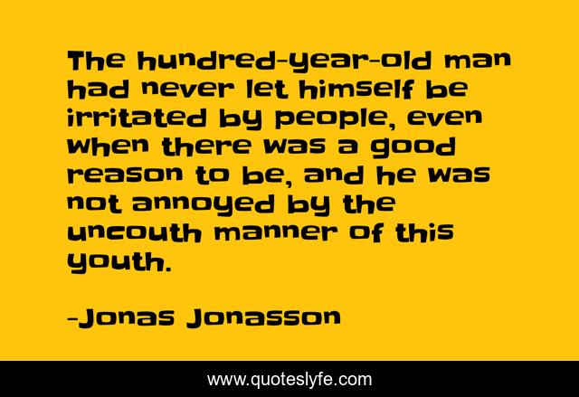 This page presents the quote "The hundred-year-old man had never let himself be irritated by people, even when there was a good reason to be, and he was not annoyed by the uncouth manner of this youth.". Author of this quote is Jonas Jonasson. .