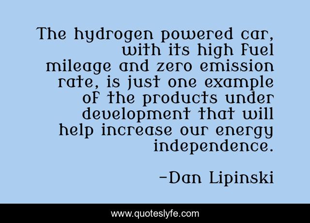 This page presents the quote "The hydrogen powered car, with its high fuel mileage and zero emission rate, is just one example of the products under development that will help increase our energy independence.". Author of this quote is Dan Lipinski. This quote is about car, help, environmental,.