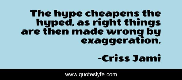 This page presents the quote "The hype cheapens the hyped, as right things are then made wrong by exaggeration.". Author of this quote is Criss Jami. This quote is about exaggeration, honesty, business, advertisement, media, cheap, reality, lies, stories,.