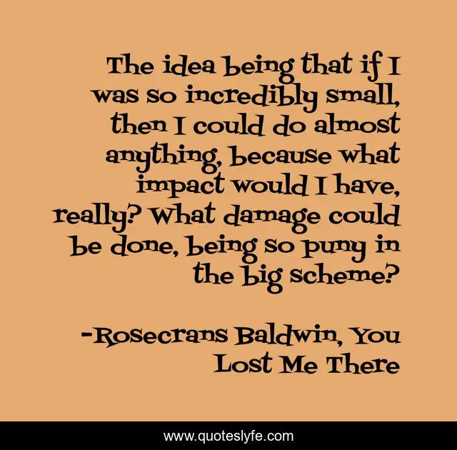 This page presents the quote "The idea being that if I was so incredibly small, then I could do almost anything, because what impact would I have, really? What damage could be done, being so puny in the big scheme?". Author of this quote is Rosecrans Baldwin, You Lost Me There. This quote is about grand-insignificance, people,.