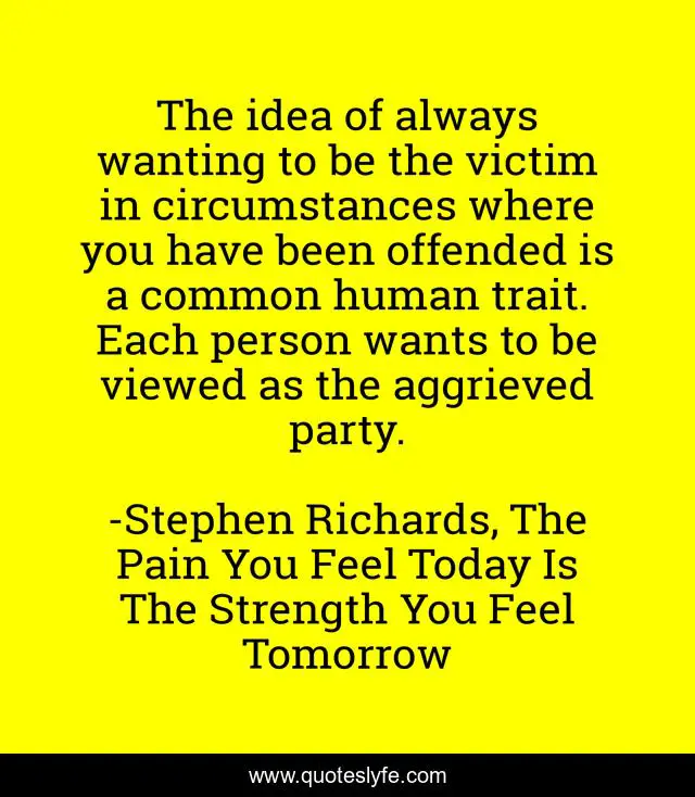 This page presents the quote "The idea of always wanting to be the victim in circumstances where you have been offended is a common human trait. Each person wants to be viewed as the aggrieved party.". Author of this quote is Stephen Richards, The Pain You Feel Today Is The Strength You Feel Tomorrow. This quote is about empowering, confidence, moving-on-and-letting-go, healing-the-past, motivational, forgive, stephen-richards-author, stephen-richards, suffering,.