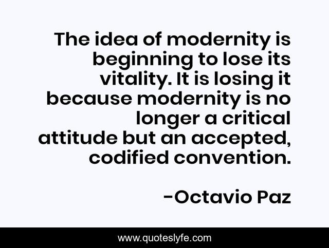 This page presents the quote "The idea of modernity is beginning to lose its vitality. It is losing it because modernity is no longer a critical attitude but an accepted, codified convention.". Author of this quote is Octavio Paz. This quote is about losing, beginning, idea,.
