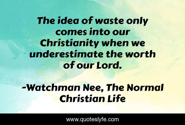 This page presents the quote "The idea of waste only comes into our Christianity when we underestimate the worth of our Lord.". Author of this quote is Watchman Nee, The Normal Christian Life. This quote is about discipleship, worship, servant-leadership,.