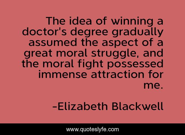 This page presents the quote "The idea of winning a doctor's degree gradually assumed the aspect of a great moral struggle, and the moral fight possessed immense attraction for me.". Author of this quote is Elizabeth Blackwell. This quote is about great, struggle, winning,.