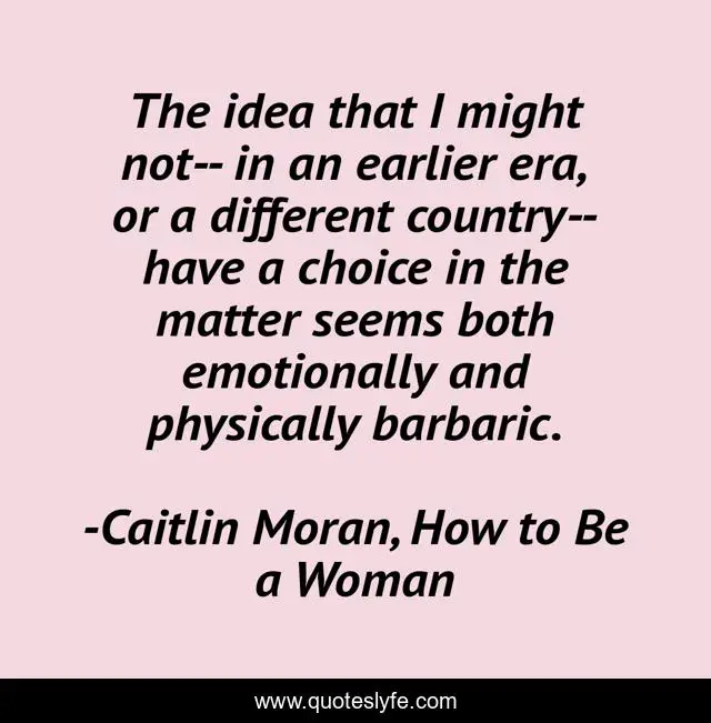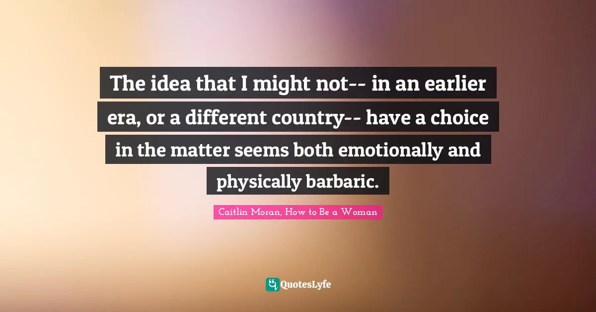 This page presents the quote "The idea that I might not-- in an earlier era, or a different country-- have a choice in the matter seems both emotionally and physically barbaric.". Author of this quote is Caitlin Moran, How to Be a Woman. .