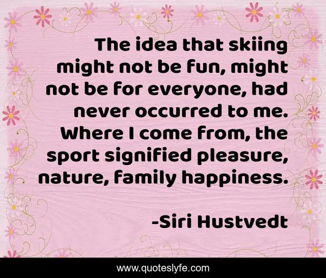This page presents the quote "The idea that skiing might not be fun, might not be for everyone, had never occurred to me. Where I come from, the sport signified pleasure, nature, family happiness.". Author of this quote is Siri Hustvedt. This quote is about fun, family, nature,.