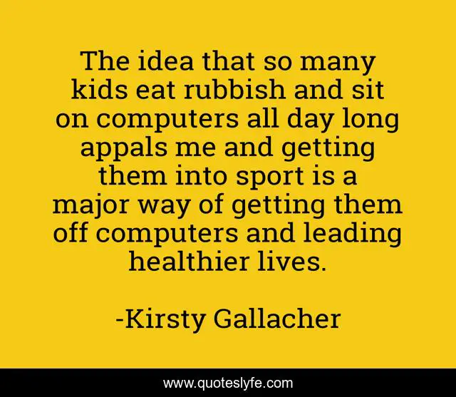 This page presents the quote "The idea that so many kids eat rubbish and sit on computers all day long appals me and getting them into sport is a major way of getting them off computers and leading healthier lives.". Author of this quote is Kirsty Gallacher. This quote is about me, day, long,.