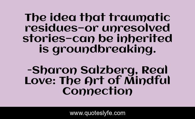 This page presents the quote "The idea that traumatic residues—or unresolved stories—can be inherited is groundbreaking.". Author of this quote is Sharon Salzberg, Real Love: The Art of Mindful Connection. This quote is about relationships, love, storytelling, communication, buddhism, trauma, inspirational, enthusiasm, meditation,.