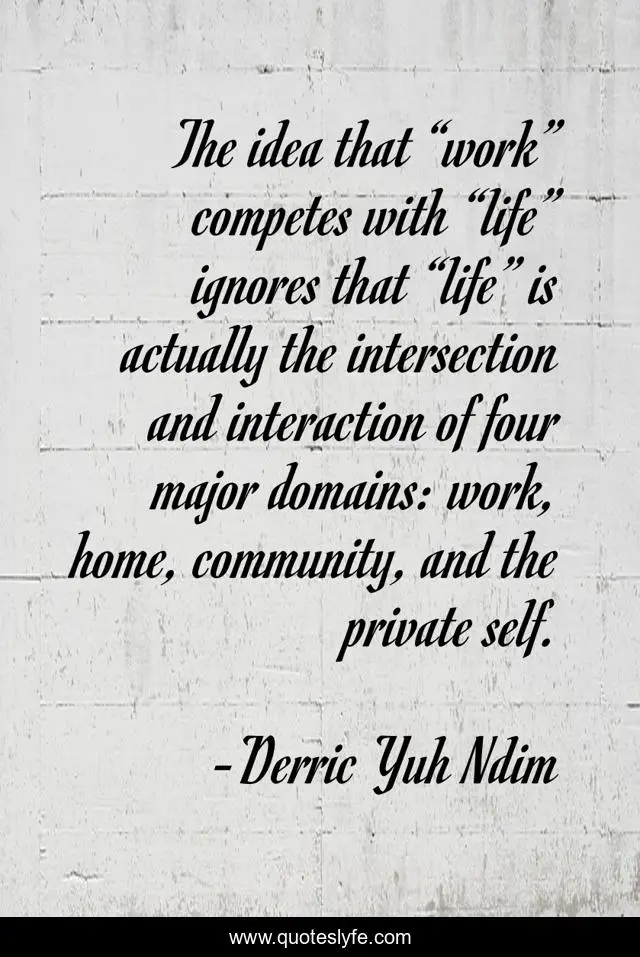 This page presents the quote "The idea that “work” competes with “life” ignores that “life” is actually the intersection and interaction of four major domains: work, home, community, and the private self.". Author of this quote is Derric Yuh Ndim. This quote is about entrepreneurship-training, inspiration, thinking, actions, entrepreneurship, unlocking-your-true-potential, values, inspirational-for-writers, personal-development,.