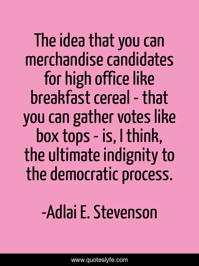 This page presents the quote "The idea that you can merchandise candidates for high office like breakfast cereal - that you can gather votes like box tops - is, I think, the ultimate indignity to the democratic process.". Author of this quote is Adlai E. Stevenson. This quote is about breakfast, think,.