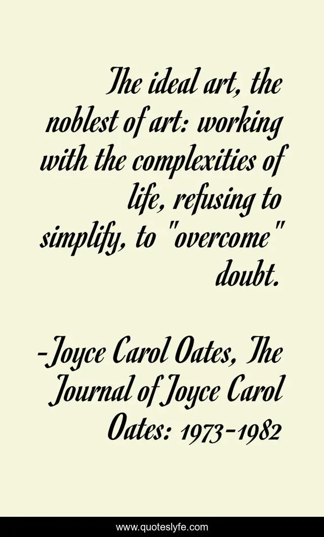 This page presents the quote "The ideal art, the noblest of art: working with the complexities of life, refusing to simplify, to "overcome" doubt.". Author of this quote is Joyce Carol Oates, The Journal of Joyce Carol Oates: 1973-1982. This quote is about complexity, art, ambiguity, writing,.