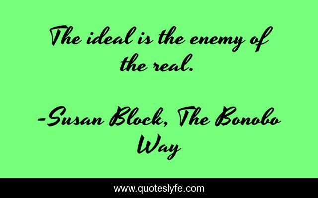 This page presents the quote "The ideal is the enemy of the real.". Author of this quote is Susan Block, The Bonobo Way. This quote is about real, ideal, philosophy-of-life,.