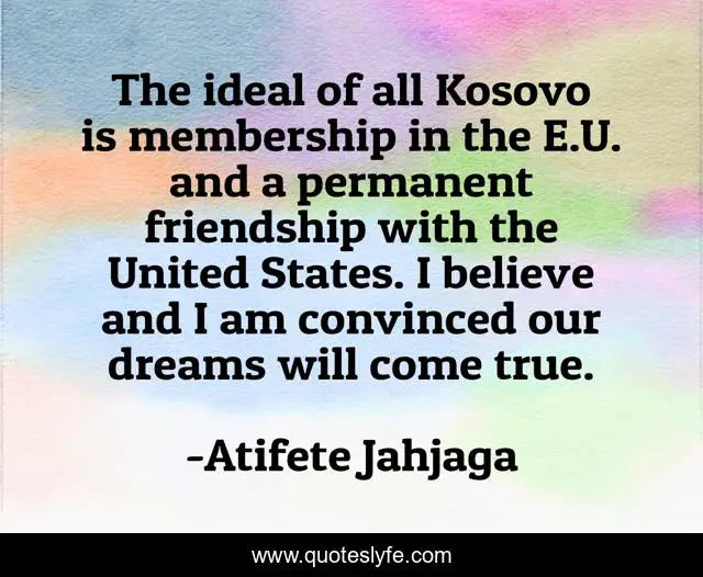 This page presents the quote "The ideal of all Kosovo is membership in the E.U. and a permanent friendship with the United States. I believe and I am convinced our dreams will come true.". Author of this quote is Atifete Jahjaga. This quote is about believe, friendship,.