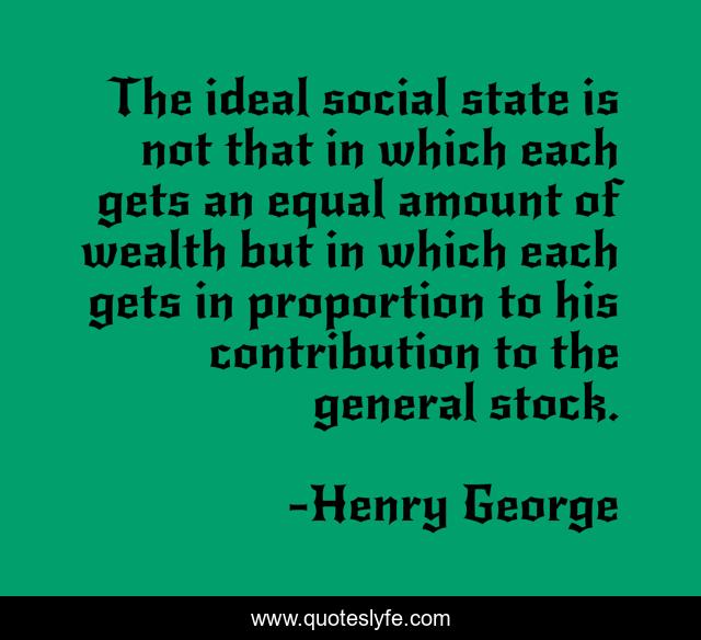 This page presents the quote "The ideal social state is not that in which each gets an equal amount of wealth but in which each gets in proportion to his contribution to the general stock.". Author of this quote is Henry George. .