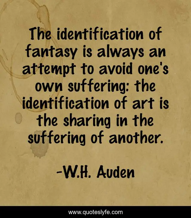 This page presents the quote "The identification of fantasy is always an attempt to avoid one's own suffering: the identification of art is the sharing in the suffering of another.". Author of this quote is W.H. Auden. This quote is about fantasy, art,.
