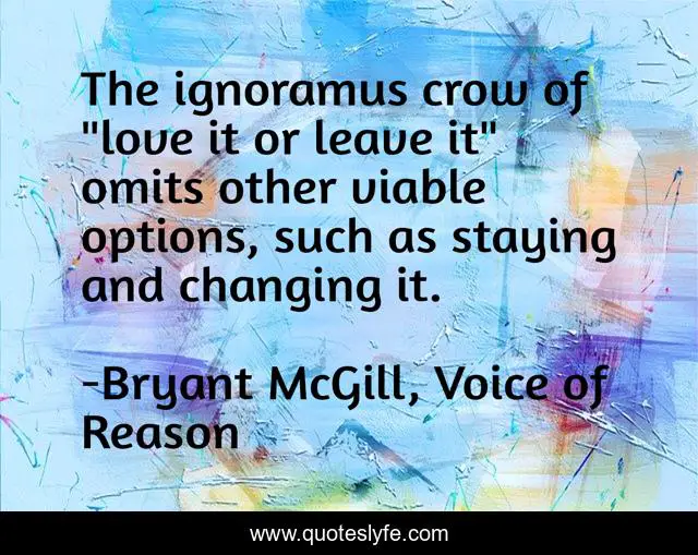 This page presents the quote "The ignoramus crow of "love it or leave it" omits other viable options, such as staying and changing it.". Author of this quote is Bryant McGill, Voice of Reason. This quote is about decision-making, decisions, options, risk-taking,.