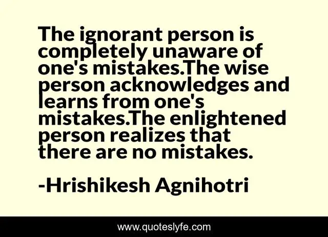 This page presents the quote "The ignorant person is completely unaware of one's mistakes.The wise person acknowledges and learns from one's mistakes.The enlightened person realizes that there are no mistakes.". Author of this quote is Hrishikesh Agnihotri. This quote is about wise, ignorant, inspirational, learn, enthusiasm, mistake, enlighten,.