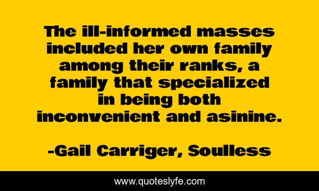 This page presents the quote "The ill-informed masses included her own family among their ranks, a family that specialized in being both inconvenient and asinine.". Author of this quote is Gail Carriger, Soulless. This quote is about soulless, humor, family,.