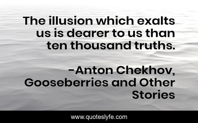 This page presents the quote "The illusion which exalts us is dearer to us than ten thousand truths.". Author of this quote is Anton Chekhov, Gooseberries and Other Stories. This quote is about illision, truth,.