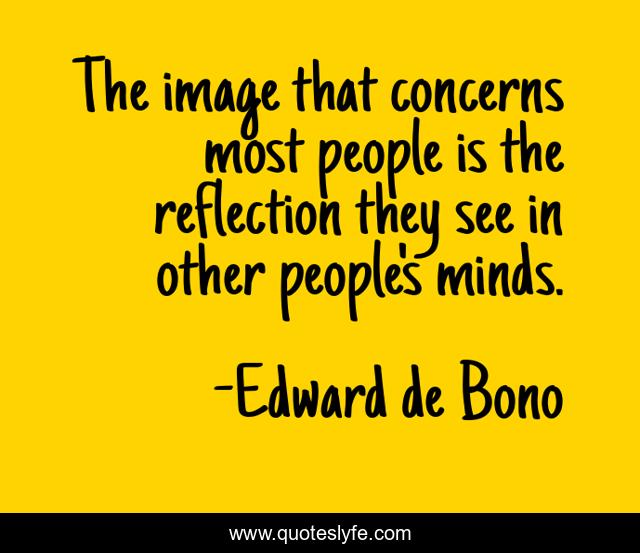 This page presents the quote "The image that concerns most people is the reflection they see in other people's minds.". Author of this quote is Edward de Bono. This quote is about confidence, perception, self-confidence, acceptance-of-oneself, self-perception, ego, self-image, self-esteem,.