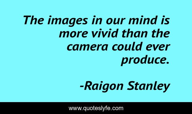 This page presents the quote "The images in our mind is more vivid than the camera could ever produce.". Author of this quote is Raigon Stanley. This quote is about brain, life, camera, mind, photography-memory-immortality,.