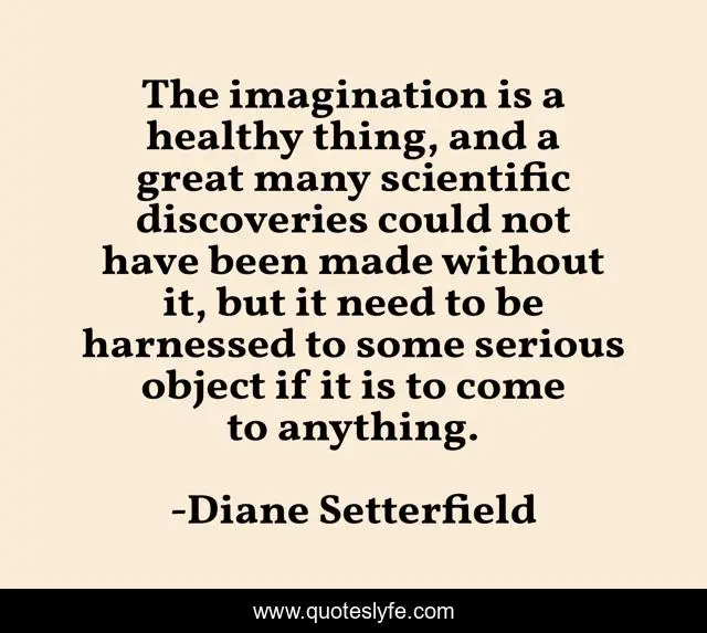 This page presents the quote "The imagination is a healthy thing, and a great many scientific discoveries could not have been made without it, but it need to be harnessed to some serious object if it is to come to anything.". Author of this quote is Diane Setterfield. This quote is about imagination, health, mind, discovery,.