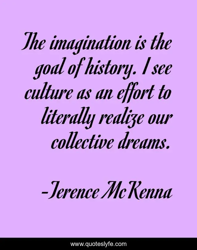 This page presents the quote "The imagination is the goal of history. I see culture as an effort to literally realize our collective dreams.". Author of this quote is Terence McKenna. This quote is about imagination, collective, history, dreams, culture,.