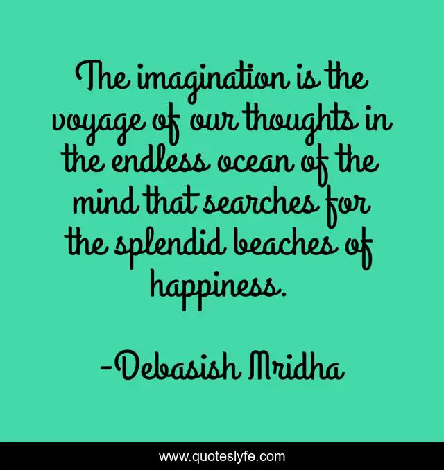 This page presents the quote "The imagination is the voyage of our thoughts in the endless ocean of the mind that searches for the splendid beaches of happiness.". Author of this quote is Debasish Mridha. This quote is about voyage-of-thoughts, imagination, beaches-of-happiness, philosophy, debasish-mridha, quotes, debasish-mridha-md, inspirational, enthusiasm,.