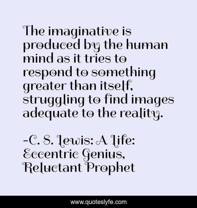 This page presents the quote "The imaginative is produced by the human mind as it tries to respond to something greater than itself, struggling to find images adequate to the reality.". Author of this quote is C. S. Lewis: A Life: Eccentric Genius, Reluctant Prophet. .