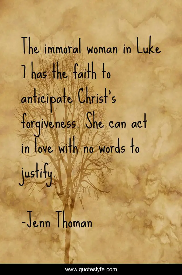 This page presents the quote "The immoral woman in Luke 7 has the faith to anticipate Christ's forgiveness. She can act in love with no words to justify.". Author of this quote is Jenn Thoman. This quote is about justification, forgiveness, argument, worship,.