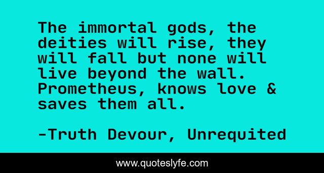 This page presents the quote "The immortal gods, the deities will rise, they will fall but none will live beyond the wall. Prometheus, knows love & saves them all.". Author of this quote is Truth Devour, Unrequited. This quote is about faith, love, kindred-spirits, joy, karmic, soul, romance, twin-flames, sated,.