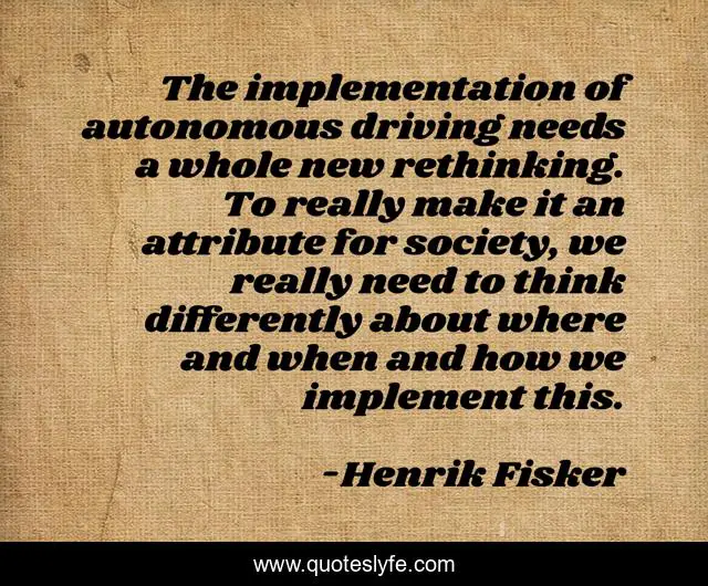 This page presents the quote "The implementation of autonomous driving needs a whole new rethinking. To really make it an attribute for society, we really need to think differently about where and when and how we implement this.". Author of this quote is Henrik Fisker. This quote is about new, think, driving,.