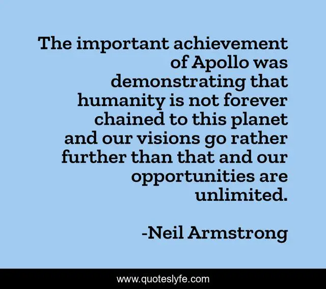 This page presents the quote "The important achievement of Apollo was demonstrating that humanity is not forever chained to this planet and our visions go rather further than that and our opportunities are unlimited.". Author of this quote is Neil Armstrong. This quote is about humanity, achievement,.