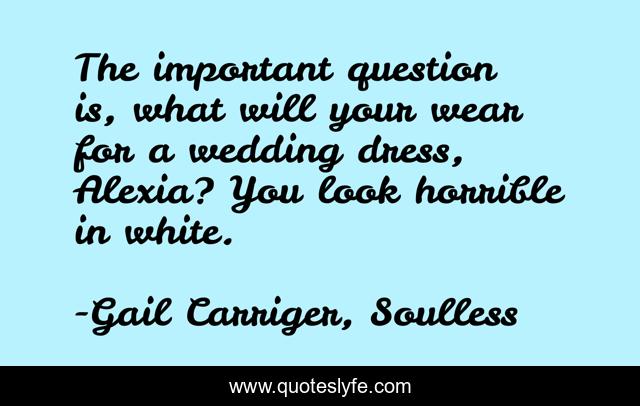 This page presents the quote "The important question is, what will your wear for a wedding dress, Alexia? You look horrible in white.". Author of this quote is Gail Carriger, Soulless. This quote is about funny, steampunk, random, witty, wedding-dresses, comedy,.
