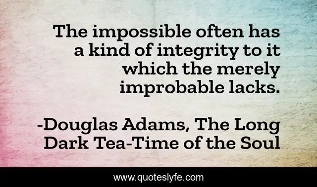 This page presents the quote "The impossible often has a kind of integrity to it which the merely improbable lacks.". Author of this quote is Douglas Adams, The Long Dark Tea-Time of the Soul. .