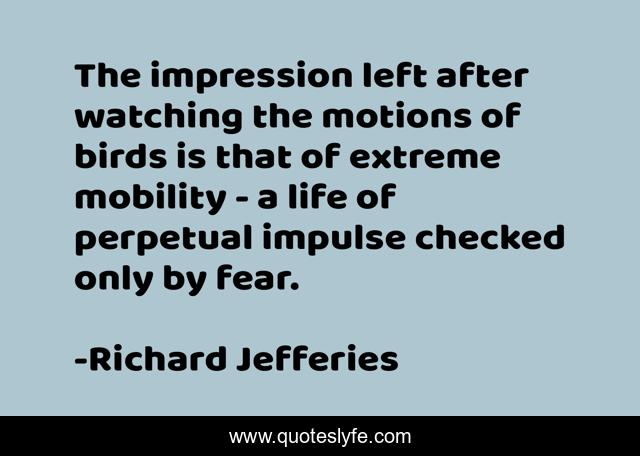 This page presents the quote "The impression left after watching the motions of birds is that of extreme mobility - a life of perpetual impulse checked only by fear.". Author of this quote is Richard Jefferies. This quote is about impression, life, birds,.