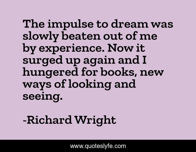 This page presents the quote "The impulse to dream was slowly beaten out of me by experience. Now it surged up again and I hungered for books, new ways of looking and seeing.". Author of this quote is Richard Wright. This quote is about me, looking, dream,.