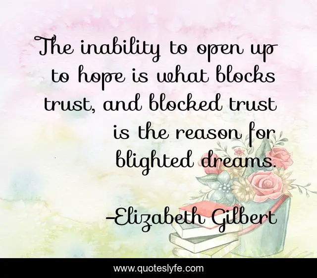 This page presents the quote "The inability to open up to hope is what blocks trust, and blocked trust is the reason for blighted dreams.". Author of this quote is Elizabeth Gilbert. This quote is about trust, dreams, blocked,.